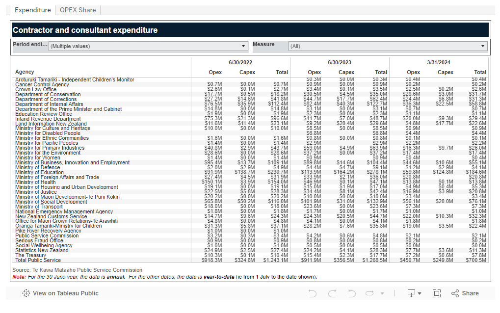 In the 9 months to March 2024, Public Service organisations spent a total of $450.7 million in OPEX and $249.8 million in CAPEX on contractors and consultants, for a total spend of $700.5 million.